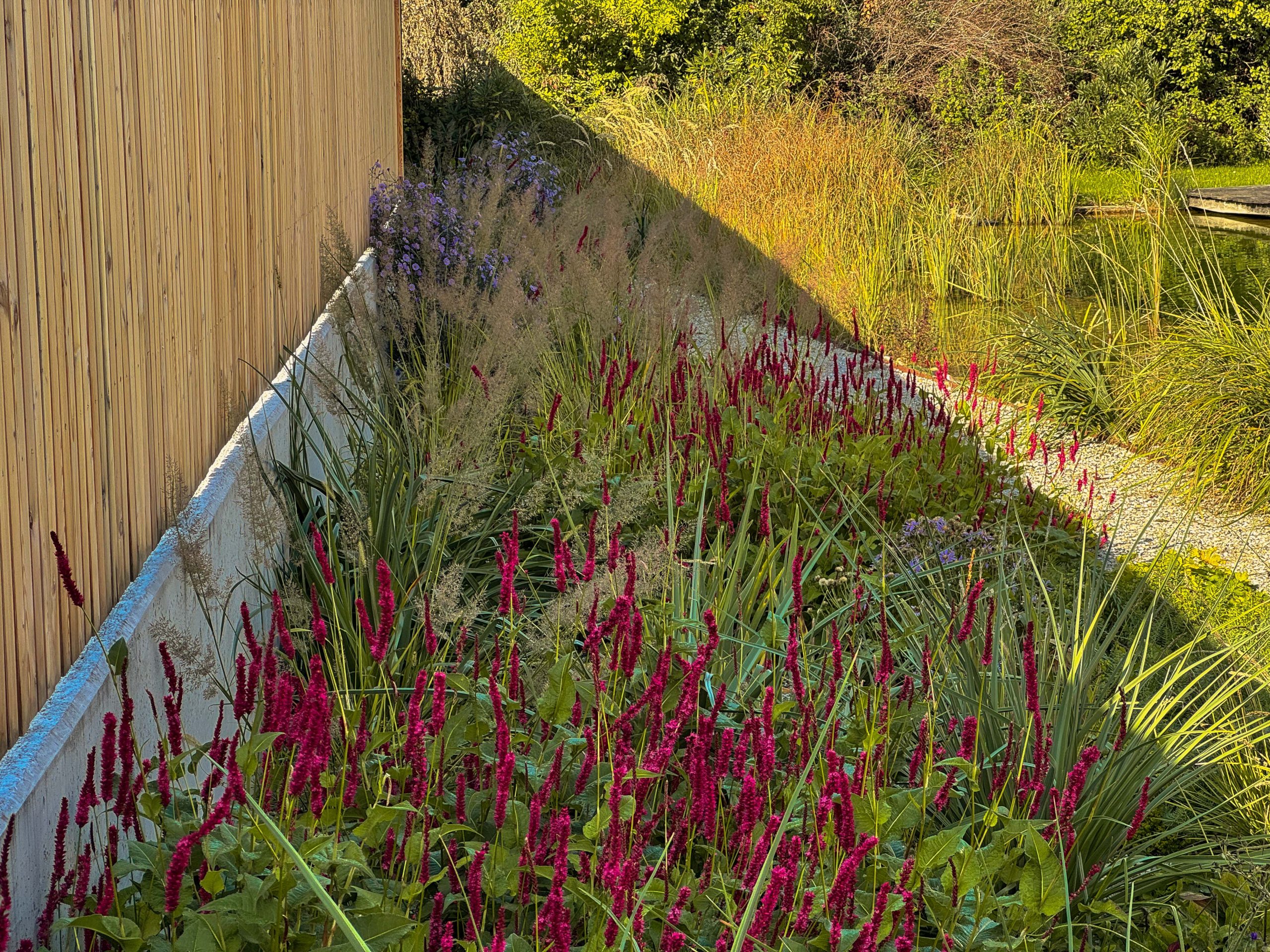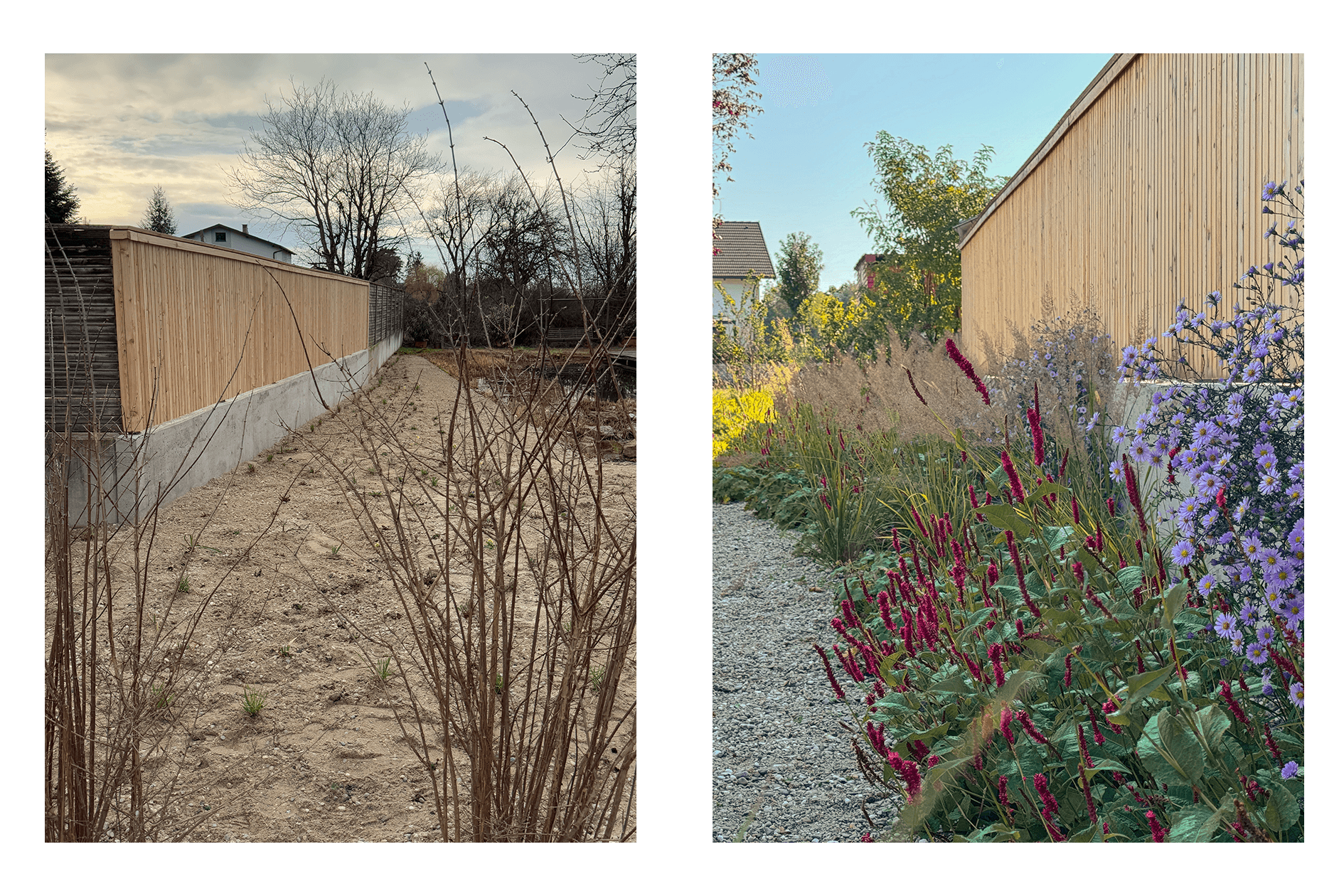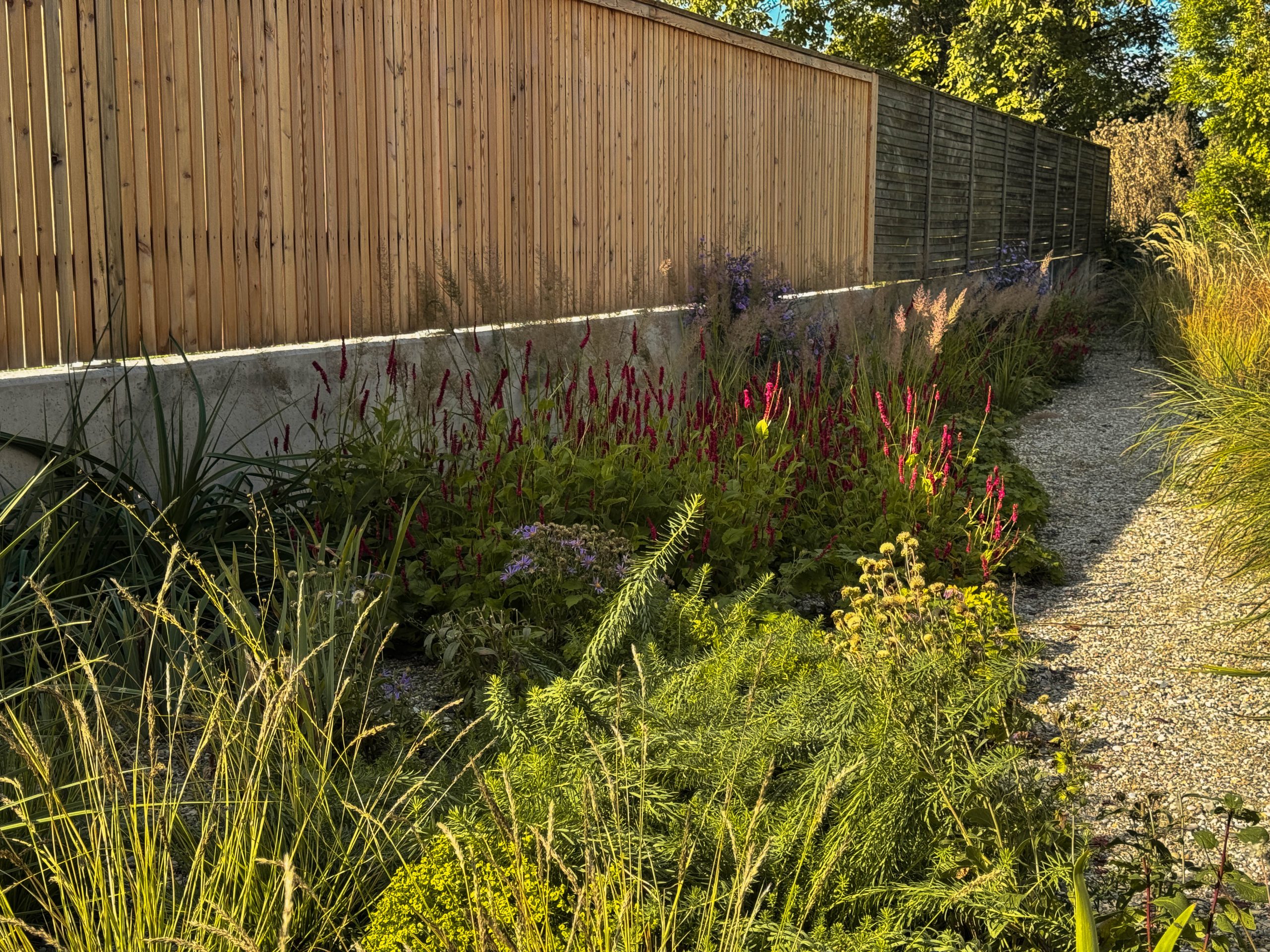 Neuer Holz-Sichtschutzzaun, der Betonsockel versteckt sich hinter einer vielfältigen Pflanzung.
