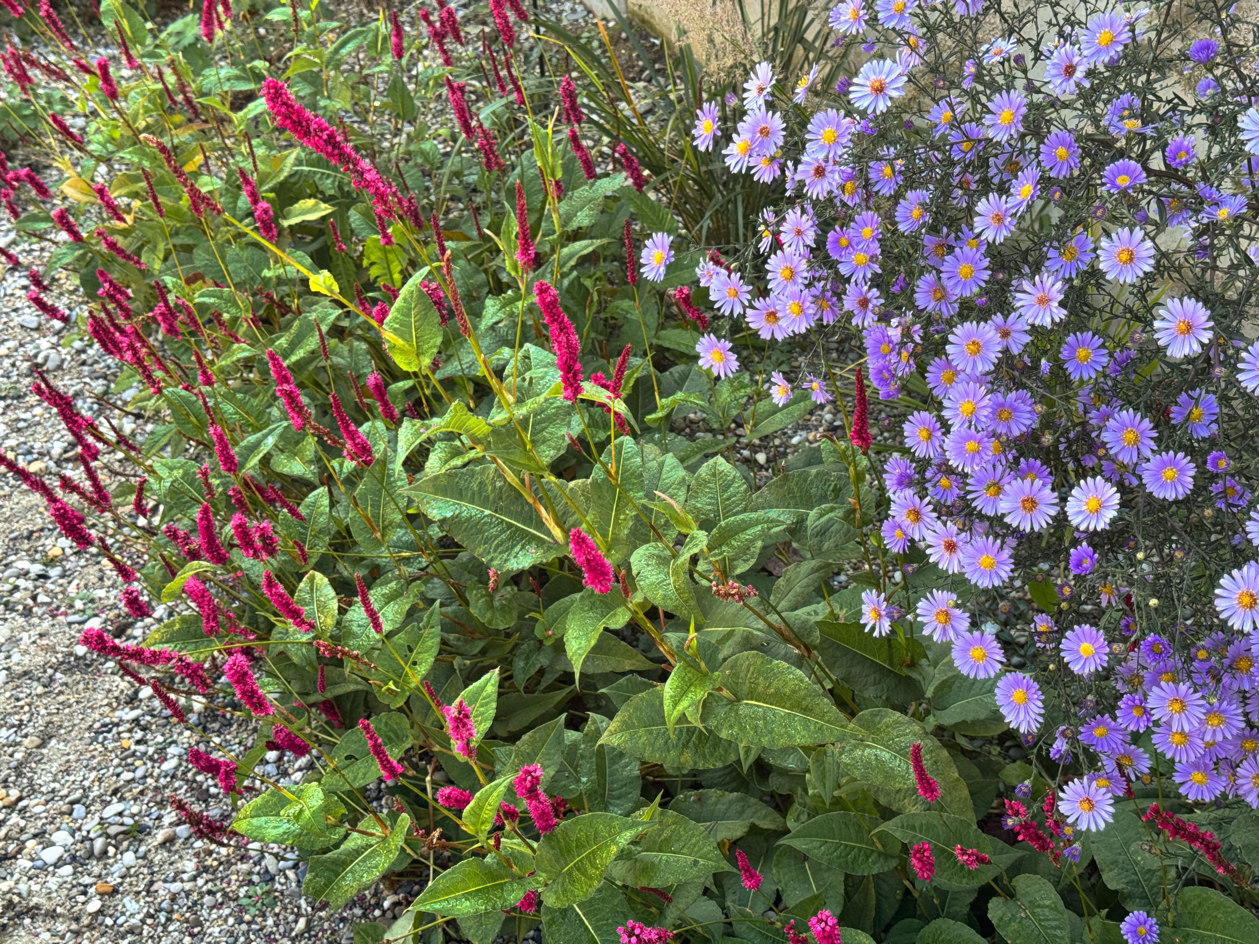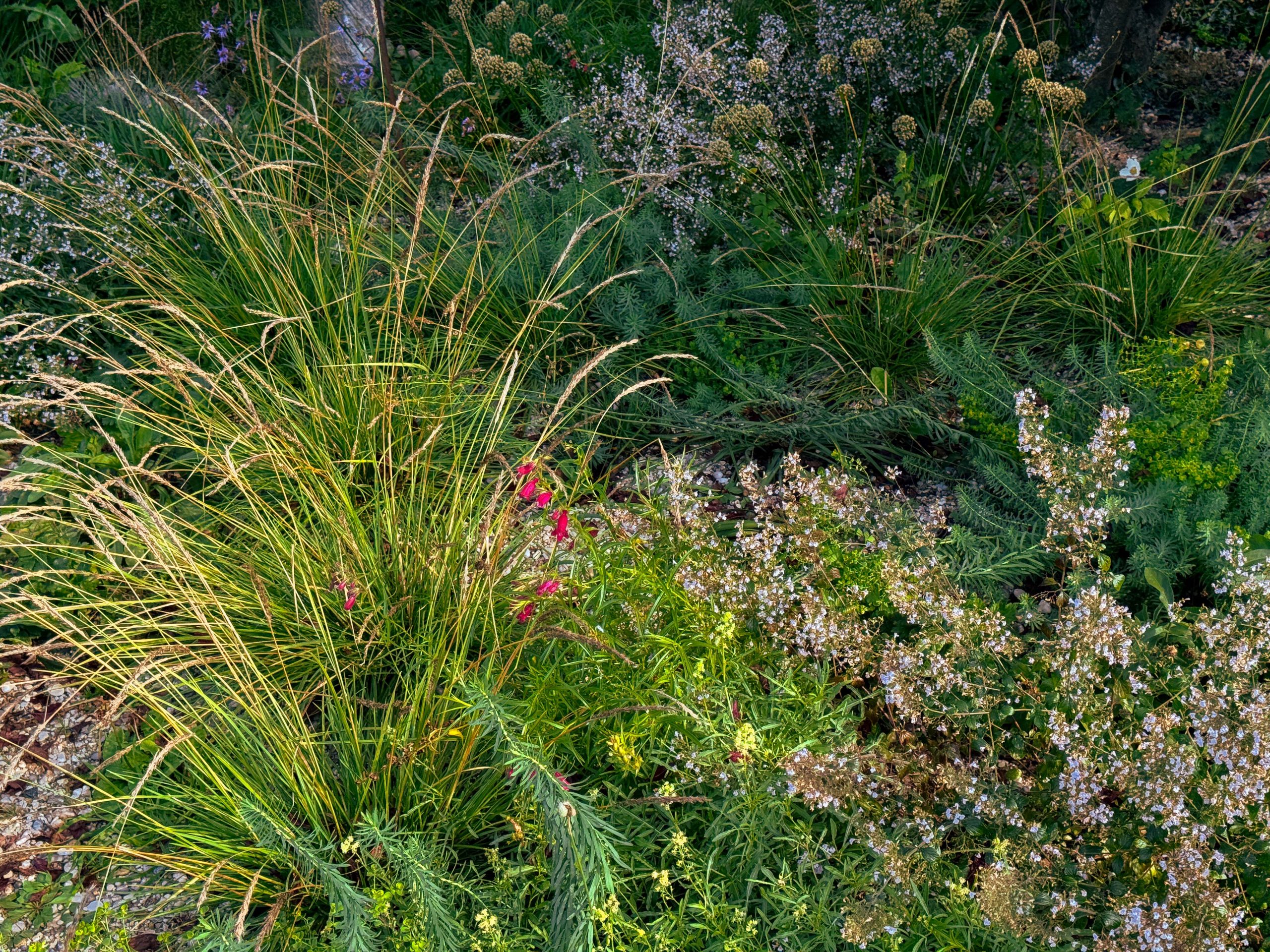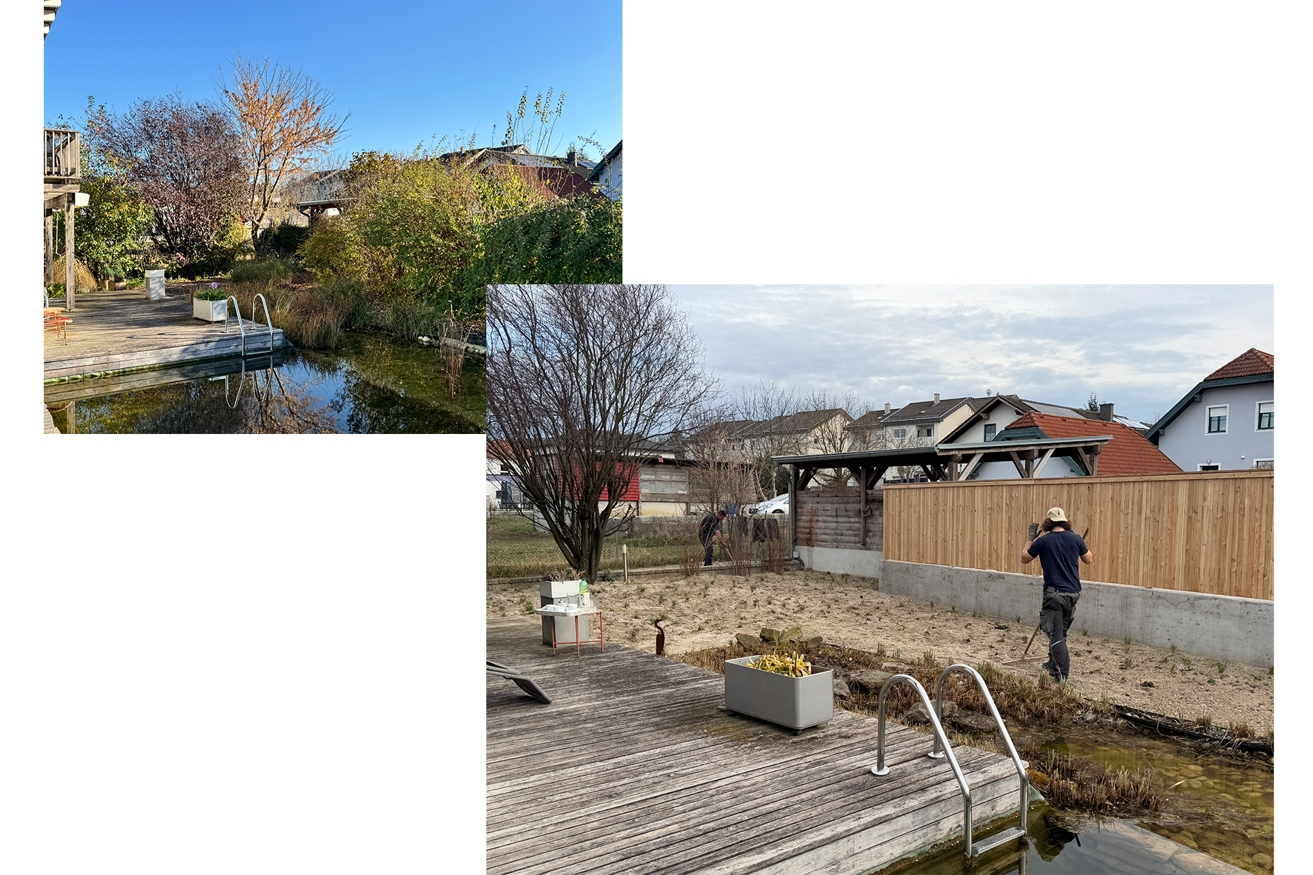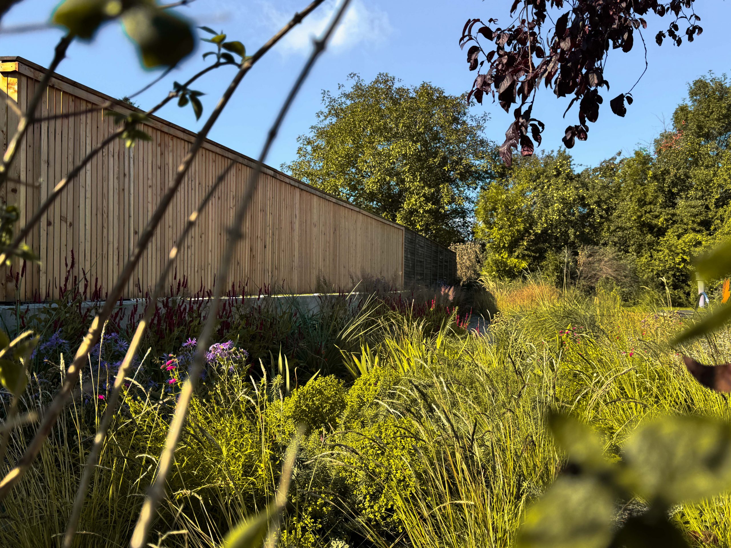 Neuer Holz-Sichtschutzzaun, der Betonsockel versteckt sich hinter einer vielfältigen Pflanzung.